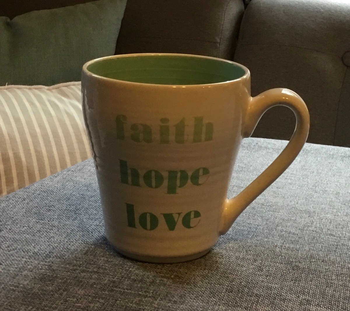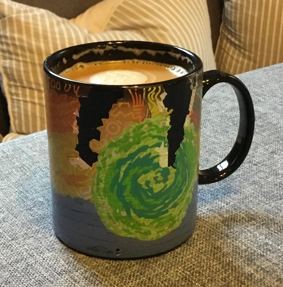 Today’s cuppa summarizes our initial feelings about finding Joey and, perhaps, Joey’s feelings about being discovered. There’s no reason we can’t get along, however, as long as we share a few apple slices and enough space for roaming.